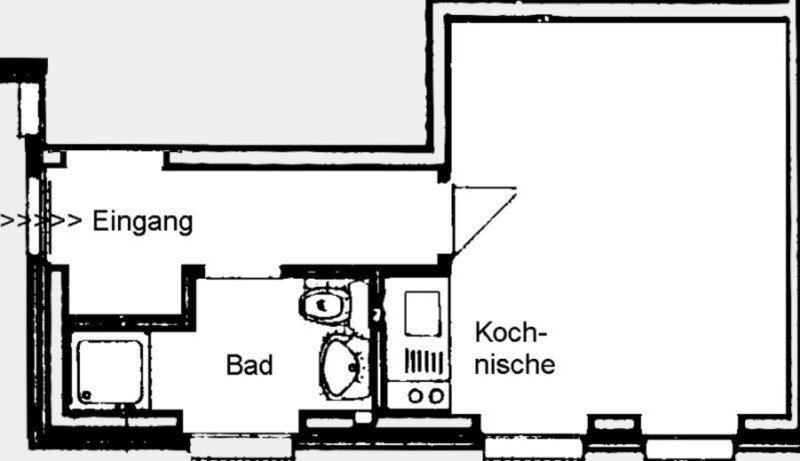 Wohnraum mit integrierter Kochnische, Badezimmer mit Dusche und Flur